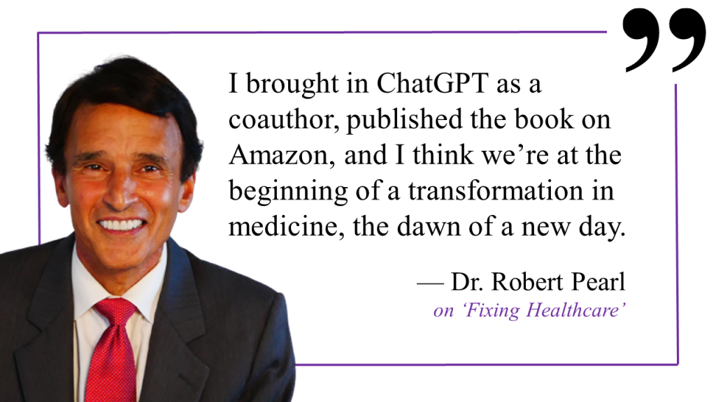 Today’s episode of Fixing Healthcare is a true sign of the times in medicine. Not only is generative AI the topic of today’s podcast, it’s also an active participant. Co-host Jeremy Corr used ChatGPT to come up with questions for fellow co-host Dr. Robert Pearl about “ChatGPT, MD,” a new book that Pearl co-authored with ChatGPT.